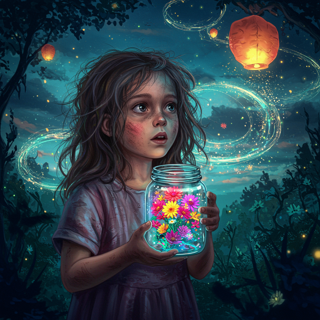A young girl with tangled hair holds a jar filled with vibrant flowers, her eyes wide with wonder as if she’s peering into a dream. The scene is set in a mystical nocturnal landscape, where the sky glows with swirling, luminescent colors that dance around her like a soft embrace. Her face, although a bit dirty, is illuminated by the ethereal light, highlighting her innocence and curiosity. The flowers in the jar seem to come alive, their petals shimmering with a multidimensional radiance that hints at an enchanting world beyond what is visible. The detailed dreamscape around her feels like a storybook illustration brought to life, with mysterious shadows and intricate patterns weaving a tapestry of imagination and wonder. The background is filled with the silhouettes of twisting trees and floating lanterns that cast a gentle, enigmatic glow across the scene, inviting viewers to step into this magical, mysterious realm.