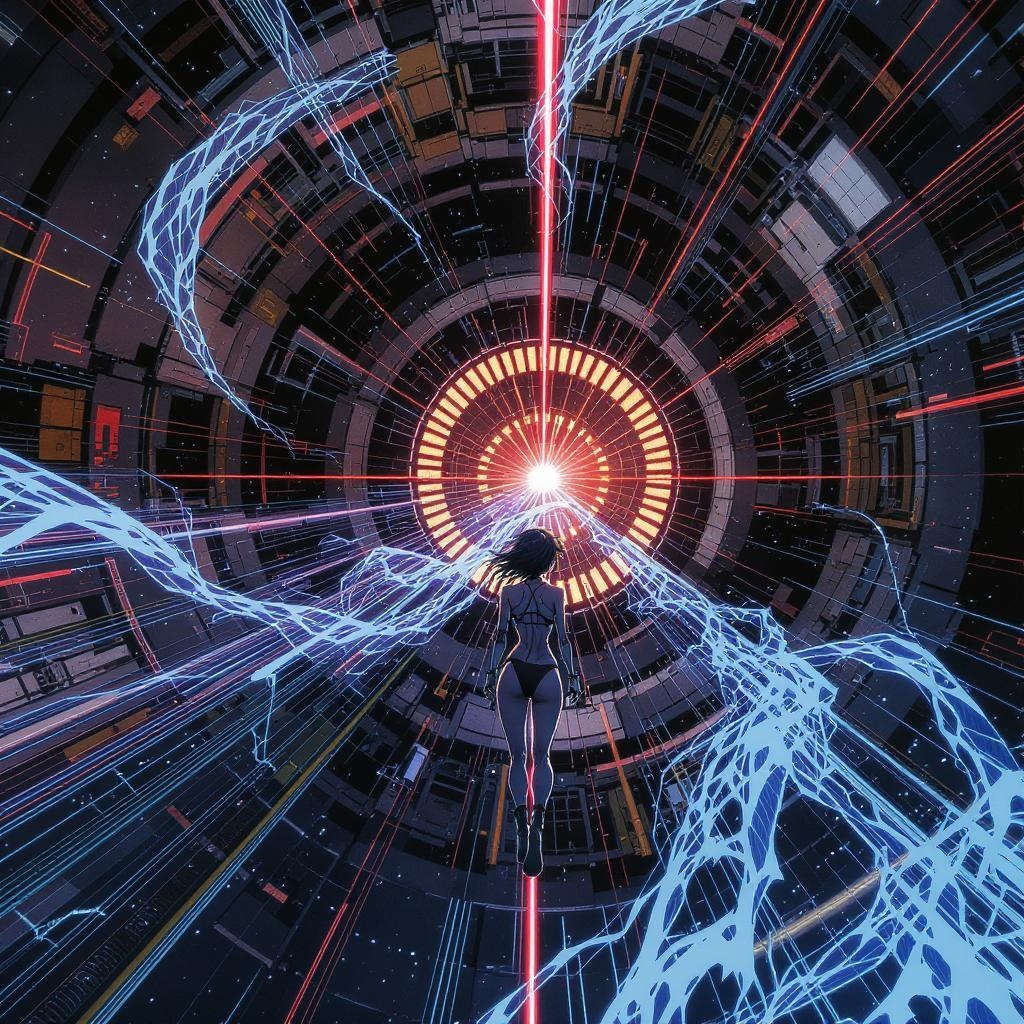 Girl in futuristic undergarments, inside an expansive spaceship, inspired by Tsutomu Nihei's style, reminiscent of Sidonia no Kishi. Gigantic structures dominate the multi-level space, centered around a powerful laser generator. Sci-fi setting with hyper-detailed elements, featuring a laser beam piercing from above, surrounded by swirling energy clots. The scene captures acceleration and a burst of light, emphasizing speed. Anime and manga aesthetics in ultra-high definition, showcasing intricate linework and vibrant details, resembling an HD 8K drawing with super-resolution, presented from a first-person perspective.