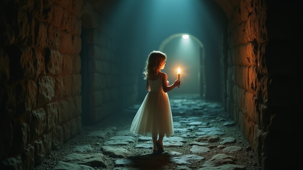 A young girl wearing a flowing white dress holds a flickering candle as she cautiously explores a dimly lit, eerie castle. Shadows dance on the ancient stone walls, creating mysterious shapes that seem to move and breathe in the corners. The air is thick with the scent of old wax and dust. Her footsteps echo through the vast, empty hallways, accompanied by the distant howl of the wind outside. Despite the foreboding atmosphere, the glow of the candle casts a warm halo that frames her delicate features, adding an element of ethereal beauty to the haunted setting. Her expression is a mix of curiosity and apprehension, as if drawn by an invisible force to uncover the secrets that the ancient, forgotten castle holds.