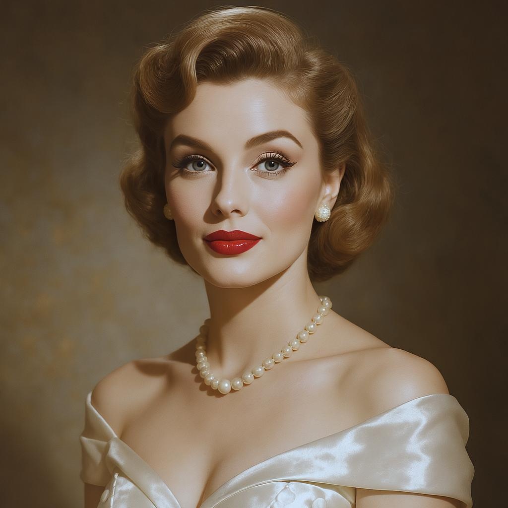 View this AI-generated image featuring graceful elegance reminiscent of a classic movie star with timeless sophistication and a hint of playful charm. Created using advanced AI technology, this image showcases creative visuals, AI artwork. Perfect for cinematic projects.