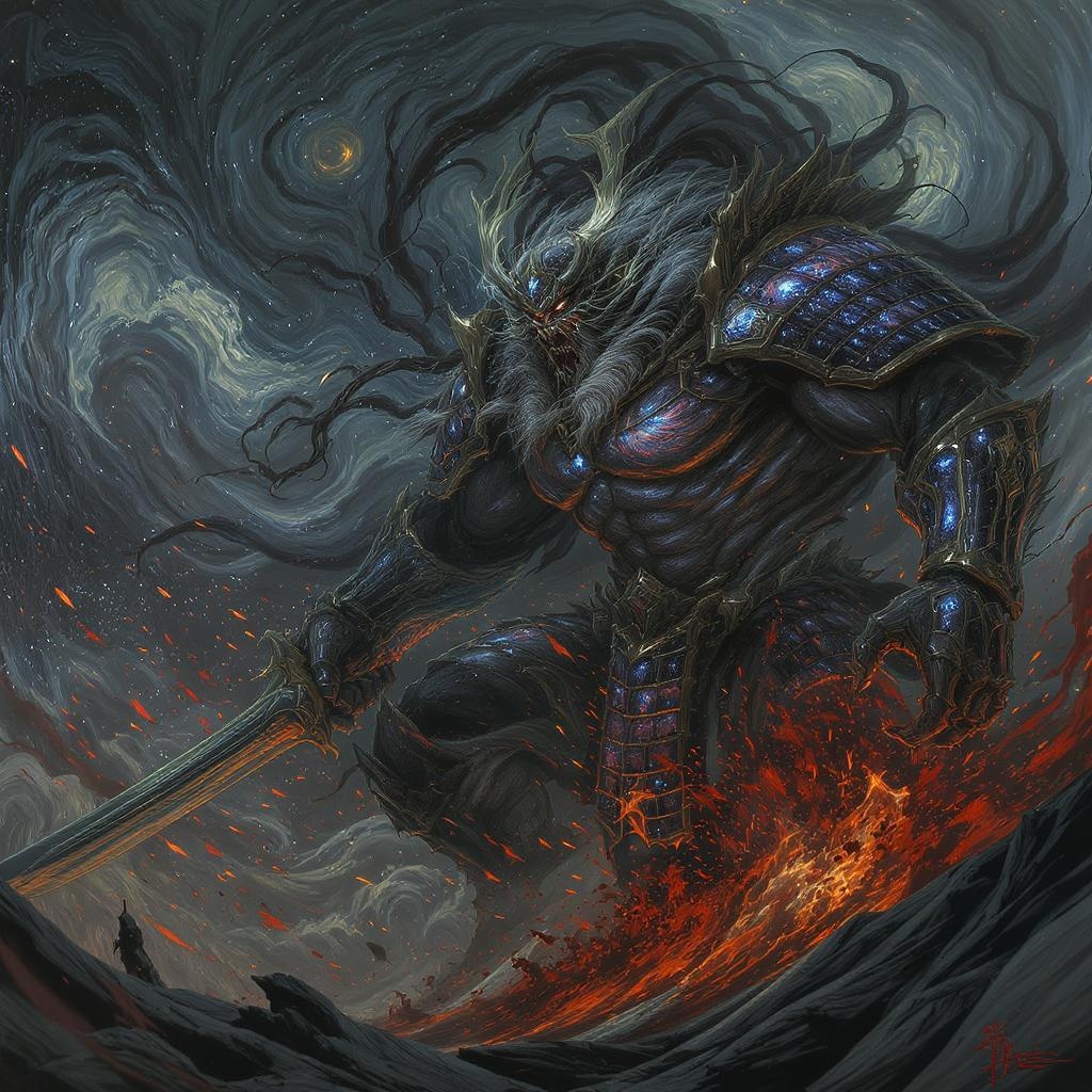An imposing, grotesque behemoth resembling a divine samurai, engaged in combat, performs a devastating attack against foes. The scene is imbued with Vincent van Gogh's swirling, emotive brushstrokes fused with FW Murano's intricate detailing. This formidable warrior is clad in full-body GALAXY armor, shimmering with cosmic hues, while ominous jet black plumes of smoke spiral around. Explosions of vibrant color burst forth amidst the chaos, the atmosphere thick with tension. The scene is dark and morbid, capturing every nuance with incredible detail, rendered in key visuals and a highly realistic style. The ultra-wide, epic shot immerses viewers, inviting them to experience the atmospheric intensity and artistic fusion --ar 3:4 --s 750.
