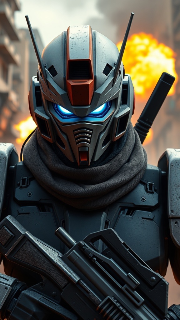 View this AI-generated image featuring gundam inspired counter terrorist from a video game universe wearing a face mask made of a sleek futuristic material with eye slits subtly glowing blue set in a war torn urban environment with explosions lighting up the background capturing a dynamic and realis