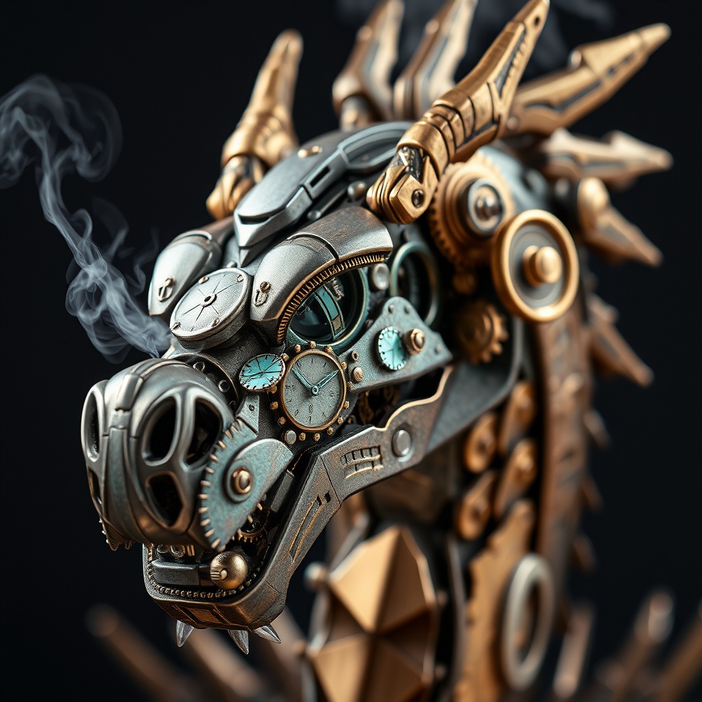 View this AI-generated image featuring headshot of a steampunk robotic dragon high quality artstation trending style sharp focus intricately detailed with clockwork elements and brass gears studio lighting textured metallic scales reflecting light vibrant color palette with hints of copper and teal