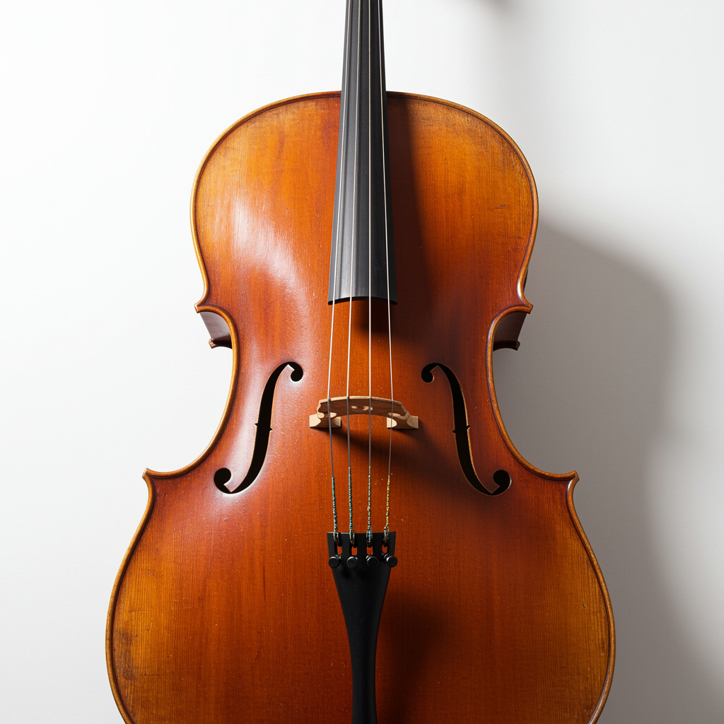 High resolution image of a cello, soft lighting, bright white background, captured with a Leica 50mm lens at f1.8, emphasizing texture and detail with subtle artistic flair.