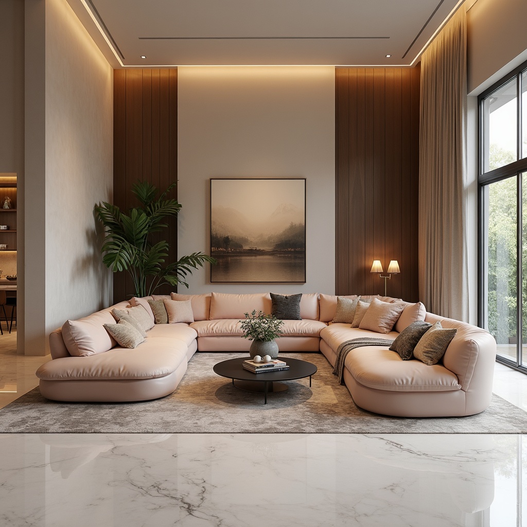 A luxurious high-resolution photography interior design features a dreamy sunken living room conversation pit with an opulent leather sectional that exudes a regal air. The space is adorned with sleek marble flooring and a soaring ceiling, creating an open and grand ambiance. Soft hues of beige, black, and pastel mingle effortlessly, crafting a sophisticated yet serene color palette. This chic environment, worthy of an interior design magazine cover, wraps you in a cozy, welcoming atmosphere.