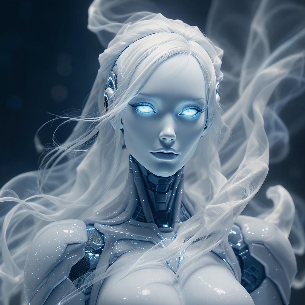 View this AI-generated image featuring humanoid android with sleek porcelain skin radiant blue eyes and ethereal presence adorned in intricately designed armor the aesthetic is woven with a spectral elegance featuring a flowing white ghost like apparition that surrounds the figure captured in hyper