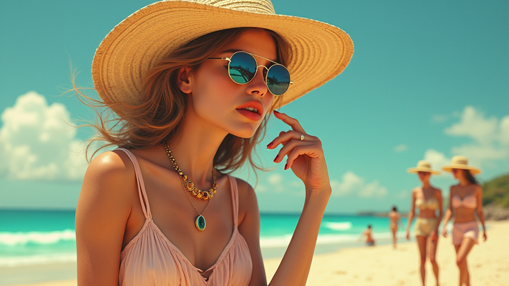 View this AI-generated image featuring hyper realistic beautifully humorous anime featuring a high fashion model in a blend of high heels and eclectic sandals accessorized with stylish hats and chic sunglasses the setting embraces a cool sun dress ambiance with a 1960s retro futuristic twist infused