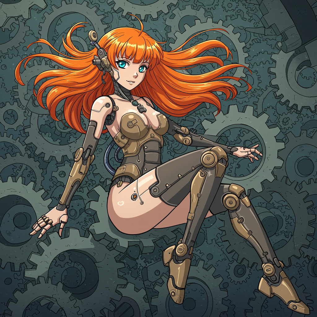 In a vibrant 2D illustration with anime style, a captivating scene unfolds featuring a cybernetic, clockwork girl with expressive eyes and perfect features. Her full body is showcased in an instagrammable, dynamic pose, characterized by intricate cybernetic and biochemical steampunk elements. She sits gracefully among a myriad of gears, her orange hair flowing artfully around her. The background is a mesmerizing sea of gears, creating a detailed and professional work with soft shadows and volumetric lighting. Her design is inspired by "Ghost in the Shell," ensuring an intricate blend of robot and human elements. The scene avoids common pitfalls such as poorly drawn hands or distorted proportions, maintaining a smooth and polished finish. The overall composition is neither monochrome nor garish but strikes a balance that highlights her unique essence without falling into cliché or unattractiveness.