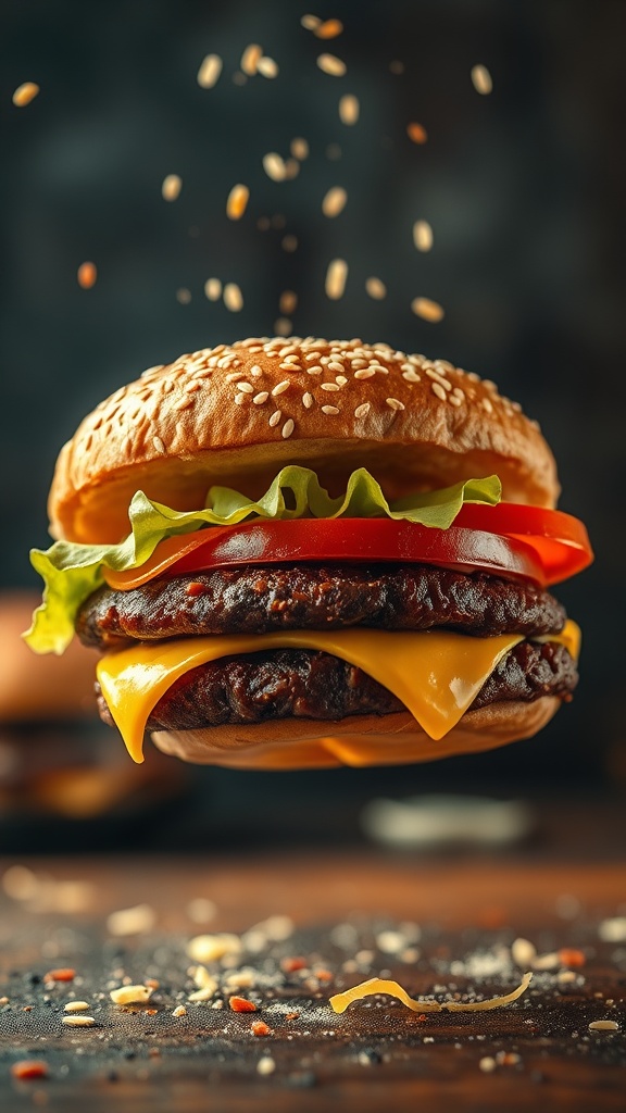 View this AI-generated image featuring a cinematic image capturing a juicy mouthwatering burger disassembling in mid air each layer suspended effortlessly with intricate details the golden brown bun with delicate sesame seeds crisp lettuce perfectly melted cheese succulent tomato slices and sizzling