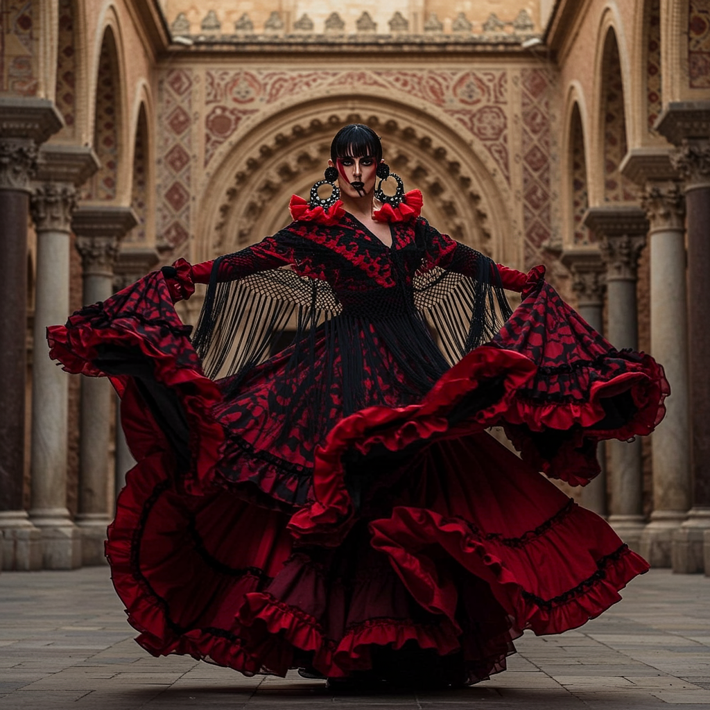 A captivating image features a figure adorned with four intricately designed giant earrings, their striking black hair cascading around them. They wear a very long, flowing dress complemented by a voluminous shawl that amplifies the dramatic flair of their outfit. The ensemble is reminiscent of a traditional bata de cola, with its frills and flounces dancing around in a vivid red and black color palette. The backdrop showcases the stunning Mudéjar style and Romanesque architecture, enhancing the sense of timeless elegance. In a moment of dynamic movement, the figure strikes a graceful dancing pose, exuding passion and emotional depth. The composition conveys an essence of tribal dark fantasy, where dramatic shadows cast an epic and expressive narrative. The scene appears to spring from a painting by Fabian Perez, capturing the essence of passionate artistry in every detail.