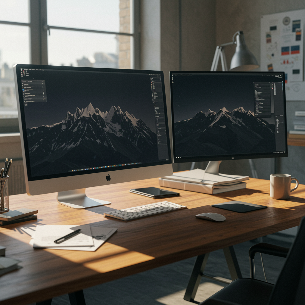 View this AI-generated image featuring a dramatic image of an imac pro and a sleek ultrawide monitor side by side on a wooden desk in a sunlit office the desk is strewn with scattered papers stationery and a coffee mug hinting at a busy workday a wide angle lens captures the scene emphasizing the sp