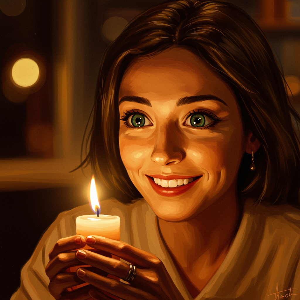 A warm, impressionistic painting featuring a charming woman with an enchanting smile, her large, reflective eyes captivated by the flickering flame of a candle she cradles. Soft, ambient light bathes the scene, casting gentle shadows that dance across her serene expression. The background hints at a cozy, intimate setting, enhancing the warmth of the image.