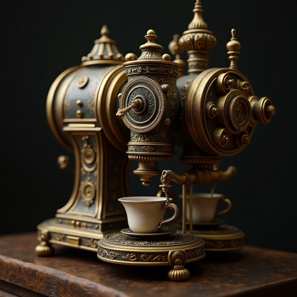 IvoryGoldAI Steampunk coffee machine, Extreme Detail, Elaborate, Ornate, 16k, UHD, HDR, Photorealistic, Hyperrealistic, Hyperdetailed, analog style, intricate, soft lighting, subsurface scattering, realistic, heavy shadow, masterpiece, best quality, ultra realistic, golden ratio, Intricate, High Detail, film photography, soft focus, demure, detailed texture, matte finish, ornate design, steampunk aesthetic, brass gears, elegant pipes, luxurious metallic sheen, refined craftsmanship, steampunk elegance, analog charm, high-resolution clarity, exquisite detail, harmonious composition, sublime artistry, seamless integration of elements, captivating allure, sophisticated design, inspired innovation.
