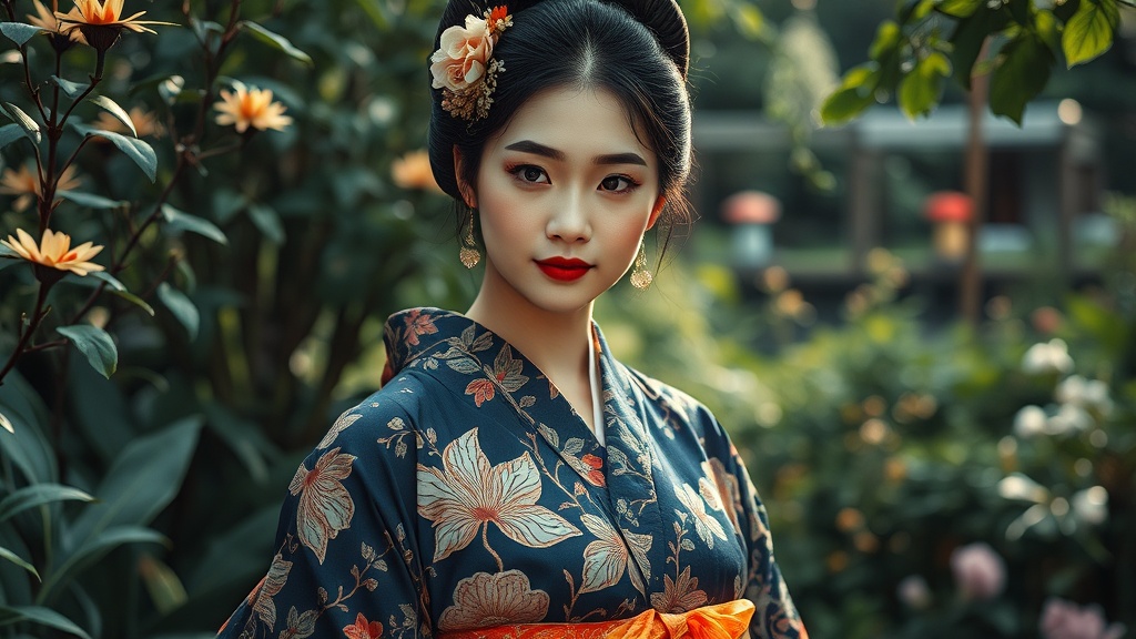 Japanese beauty in a kimono adorned with intricate floral patterns, set amidst a lush garden. The scene unfolds in a palette of dark silver and navy, with fine lines and delicate curves, reminiscent of Qian Xuan’s artistry. Hints of light gold highlight the ensemble, evoking a sense of classic Hollywood glamour with a medieval touch. Captured through a Samyang AF 14mm f/2.8 RF lens, the composition echoes Bella Kotak’s ethereal style, photographed using a Nikon D750 for a curvilinear perspective. The atmosphere is expressive, blending timeless elegance with modern flair.
