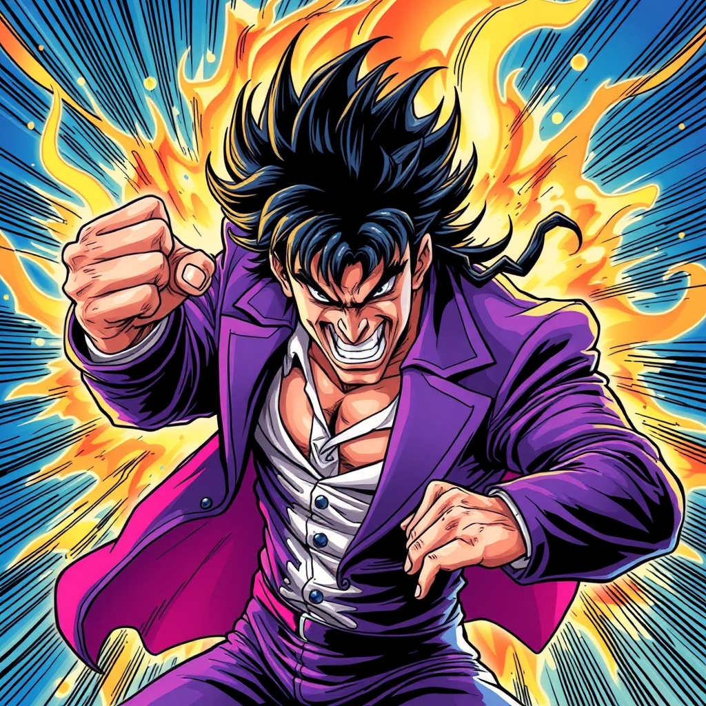 Jotaro Kujo from JoJo's Bizarre Adventure, striking a heroic pose, his face contorted in righteous fury, surrounded by a swirling, vibrant background that conveys intense energy and motion, embodying the distinctive artistic style of Hirohiko Araki. Art features dynamic lines and bold contrasts, capturing the essence of manga storytelling with a focus on dramatic tension and vivid detail. The composition is clear and sharp, showcasing Jotaro’s intense expression and iconic attire, while maintaining a heightened sense of drama and visual impact.