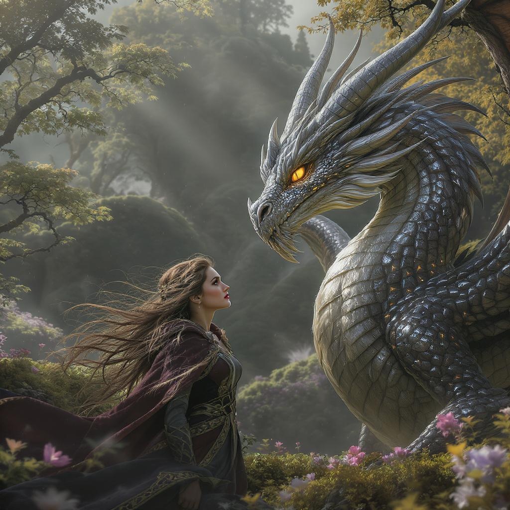 View this AI-generated image featuring in a distant kingdom nestled between rolling emerald hills and towering ancient forests a young princess with a spirit as untamed as the wind forms an unexpected bond with a wise and enigmatic dragon as whispers of danger loom on the horizon threatening the har