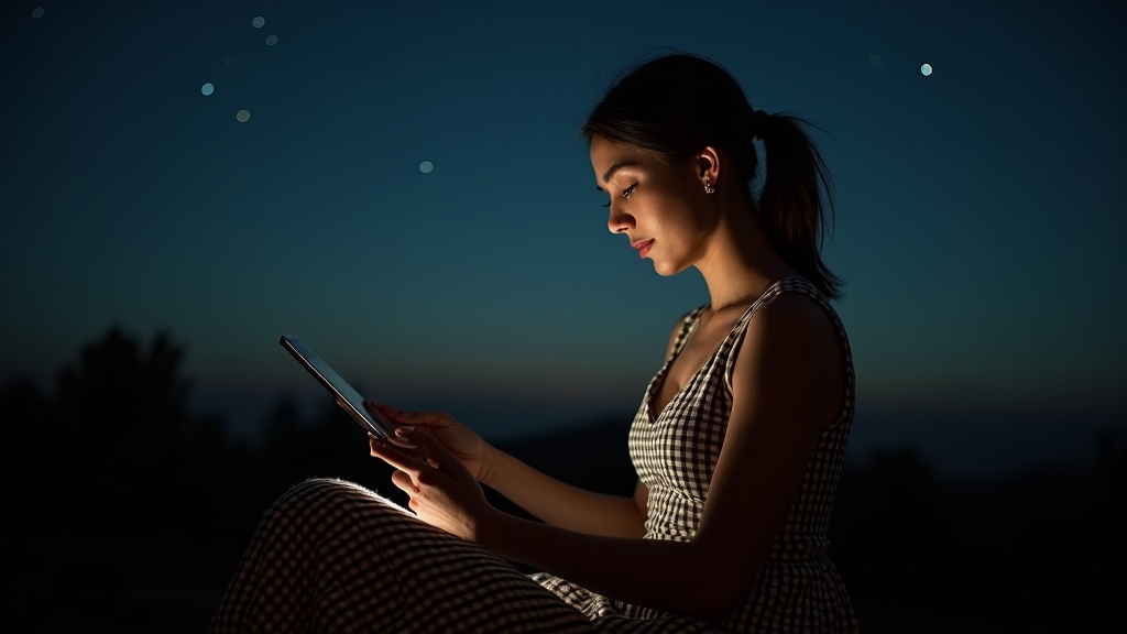 View this AI-generated image featuring kodak portra 400 8k a graceful woman seated with a tablet wearing a sophisticated checkered dress under the stars outdoor evening setting soft volumetric lighting realistic and highly detailed photography subtle contrast tranquil atmosphere portrait orientation