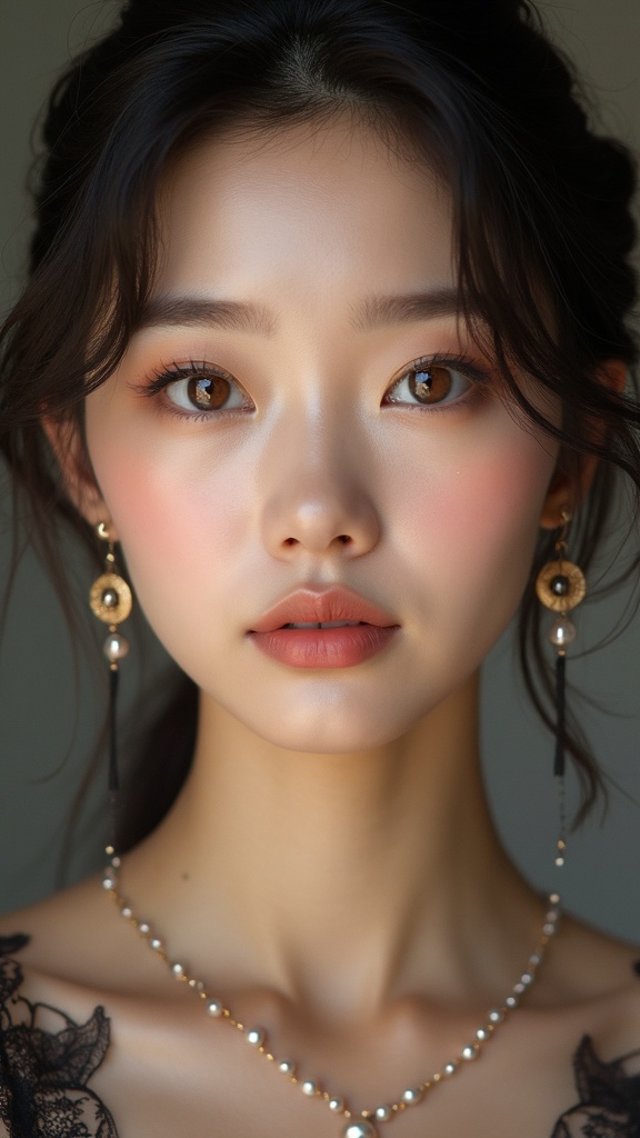 A stunning Korean woman with the allure of a K-pop idol, featuring perfectly symmetrical eyes, captured in 8k ultra high-resolution photography. Her face is beautifully detailed with striking dramatic lighting that enhances every feature with hyperrealism. Adorned with elegant jewelry and intricate buttons, she exudes sophistication and charm, her eyes glistening with captivating detail.