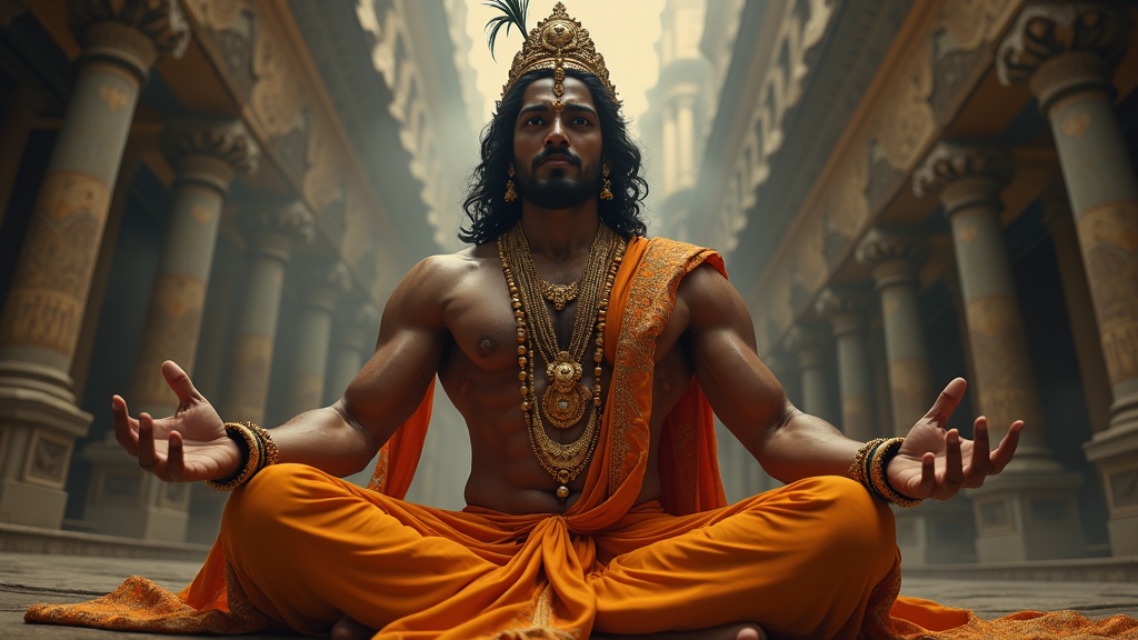 Krishna, captured from an ultra-wide angle, exudes an aura of divine grandeur. The camera pulls back to reveal the full stature of this ultra-realistic Indian male figure, whose muscular physique is depicted with utmost precision. His perfect face is a study in symmetry, with eyes that are both captivating and serene. His two strong arms end in perfect hands, each with five immaculate fingers. The scene is sharpened to highlight brilliant colors, immersing the viewer in a world rich with orientalist details. His legs are elegantly showcased, giving a sense of grounded power. Influences of William Blake Richmond and John William Waterhouse are evident in the intricate and dreamy composition. The setting is cinematic and highly detailed, with dramatic lighting that enhances the hyper-realism of the portrait. Every aspect is rendered in high definition, ensuring an 8K display of visual mastery.