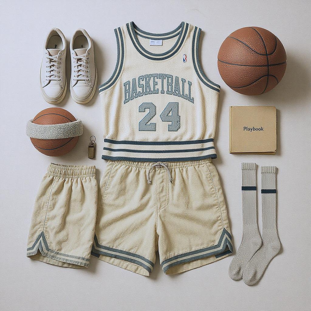 A flat lay photograph of an old-school basketball outfit neatly arranged, featuring a Wes Anderson-inspired color palette with pastel hues and muted tones; studio lighting with a soft, even glow, and gentle low contrast in 8k resolution, aspect ratio 4:5, quality level 2. The composition includes vintage sneakers, a retro basketball jersey, worn-in shorts, a classic leather basketball, tube socks, and a sweatband, all meticulously organized. The scene is accented with subtle props like a vintage whistle and a folded playbook, enhancing the nostalgic aesthetic.