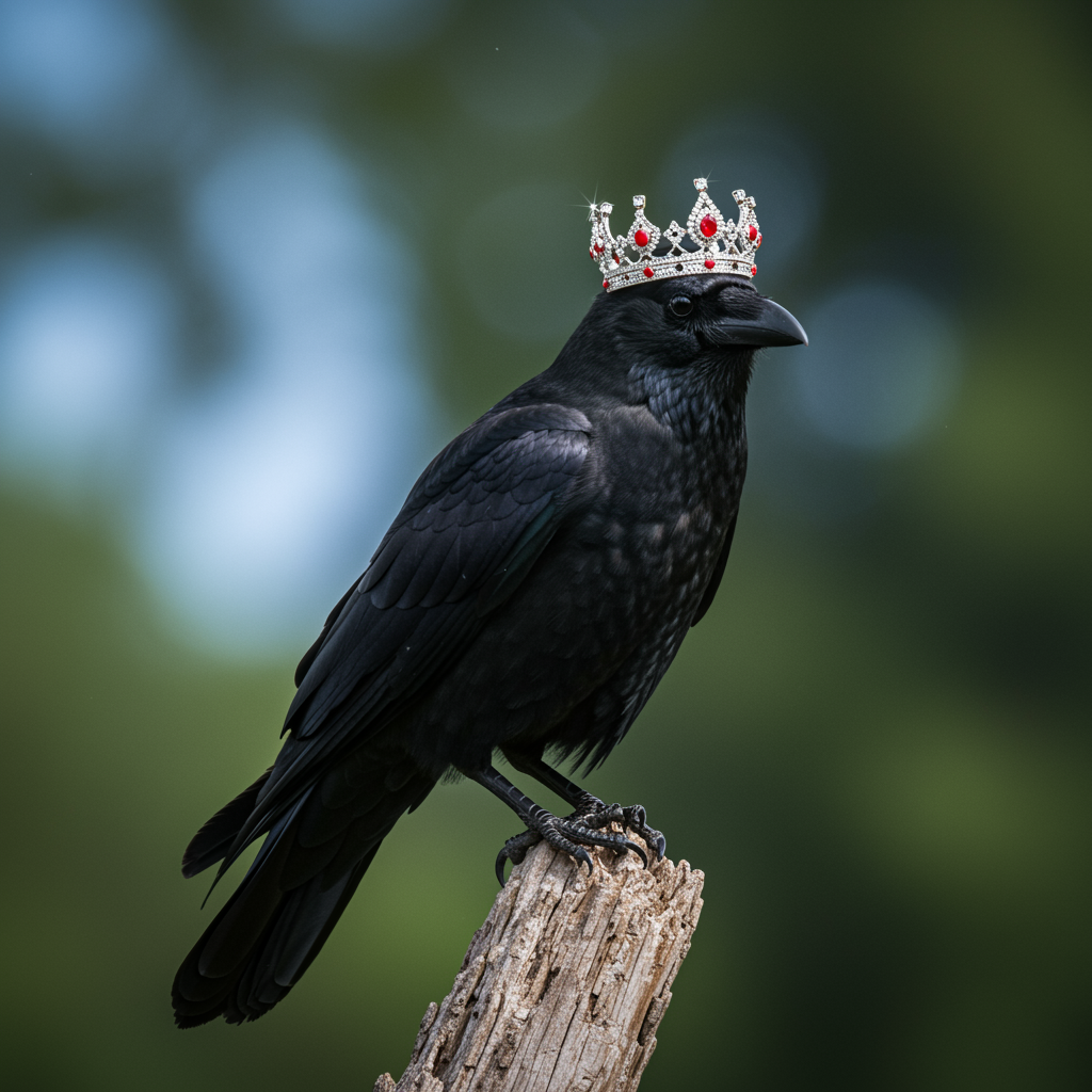 Majestic crow perched gracefully, its striking crown adorned with glimmering jewels reflecting the sunlight, exuding an aura of regal elegance enhanced by subtle touches of deep, dark tones.