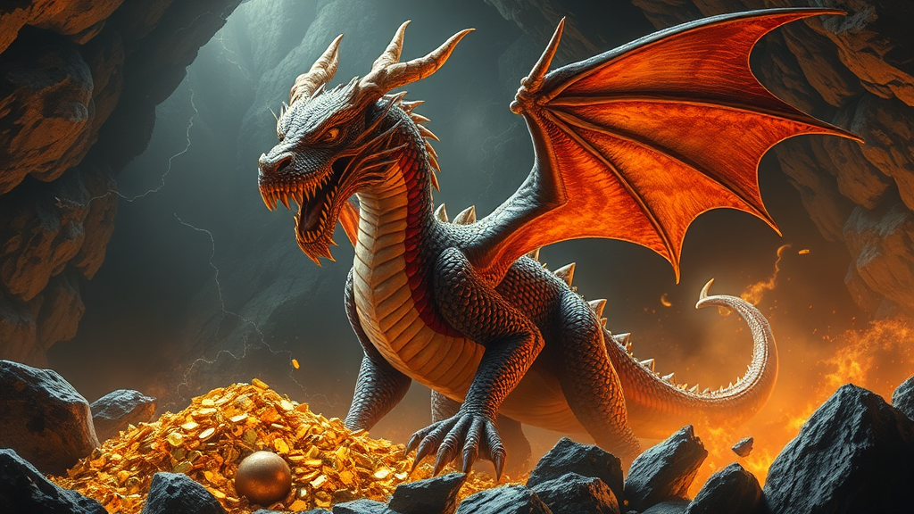 Majestic dragon sentinel: Its eyes gleam with a shrewd intelligence, the dragon stands vigilant in the treasure cavern, safeguarding piles of shimmering gold and cherished relics. Ready to unleash its scorching breath and razor-like claws against any trespassers, it embodies both grace and menace. The air around it crackles with latent power as the ancient guardian surveys its domain with unwavering diligence.