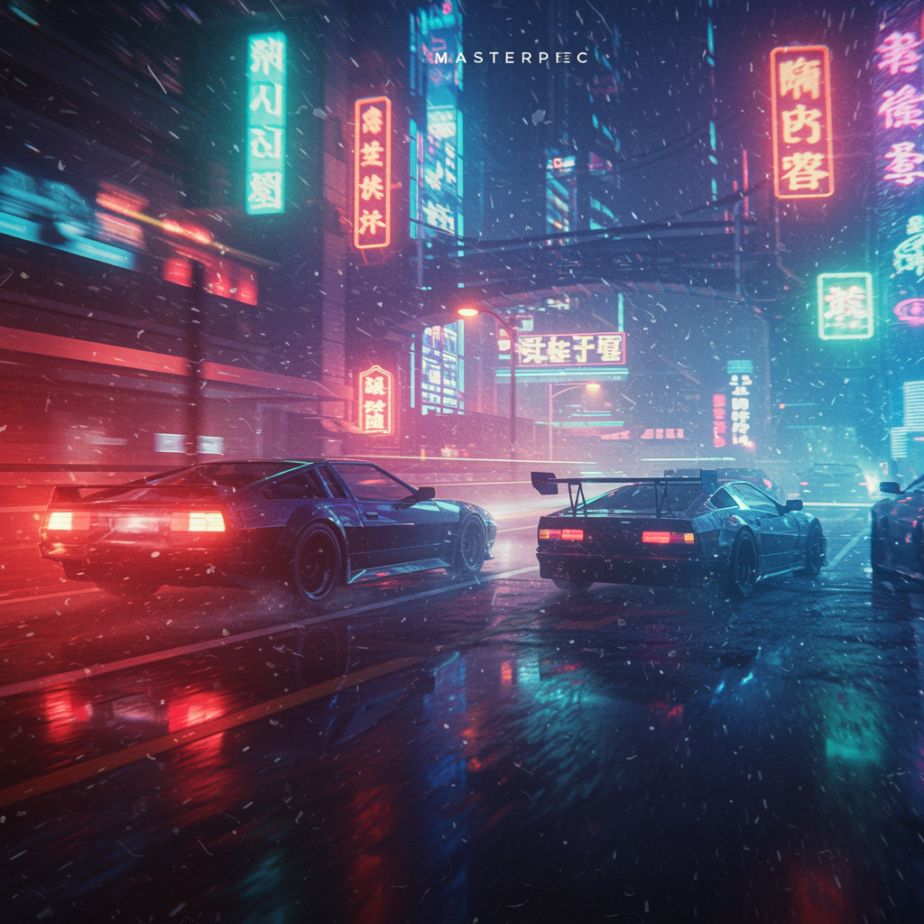 View this AI-generated image featuring masterpiece best quality action movie poster of a high speed race through a neon lit cyberpunk city at night captured in breathtaking motion with the vehicles almost becoming streaks of light due to their insane velocity set against rainy conditions the scene i