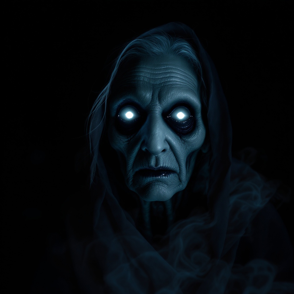 Menacing eerie apparition of an elderly ghostly woman, set against a pitch-black background. Her eyes are vacant with unsettling white pupils, illuminated by an ethereal blue-grey light casting shadows across her gaunt face. The close-up view enhances the terror, capturing every wrinkle and crease in a hyperrealistic and ultra-detailed manner. The atmosphere is one of horror, deeply haunting and rendered with 8k precision, bringing a chilling presence to life with slightly elongated features and mysterious wisps of spectral mist swirling around her.