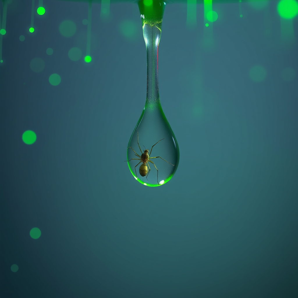 View this AI-generated image featuring microscopic image of mites suspended in a water droplet glowing green sparks cascading from above over a gradient backdrop vivid luminous sparks radiating green light soft depth of field with cinematic volumetric lighting detailed and ultra realistic artistic c