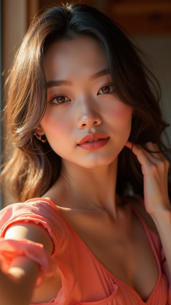 A Chinese model takes a selfie, exuding the charm of social media influencers, captured with a webcam aesthetic inspired by Felicia Simion, featuring the vibrant tones of Provia film. The image reflects a glossy, polished look with a hint of shine, composed in a striking vertical format, emphasizing modern style and dynamic expression.