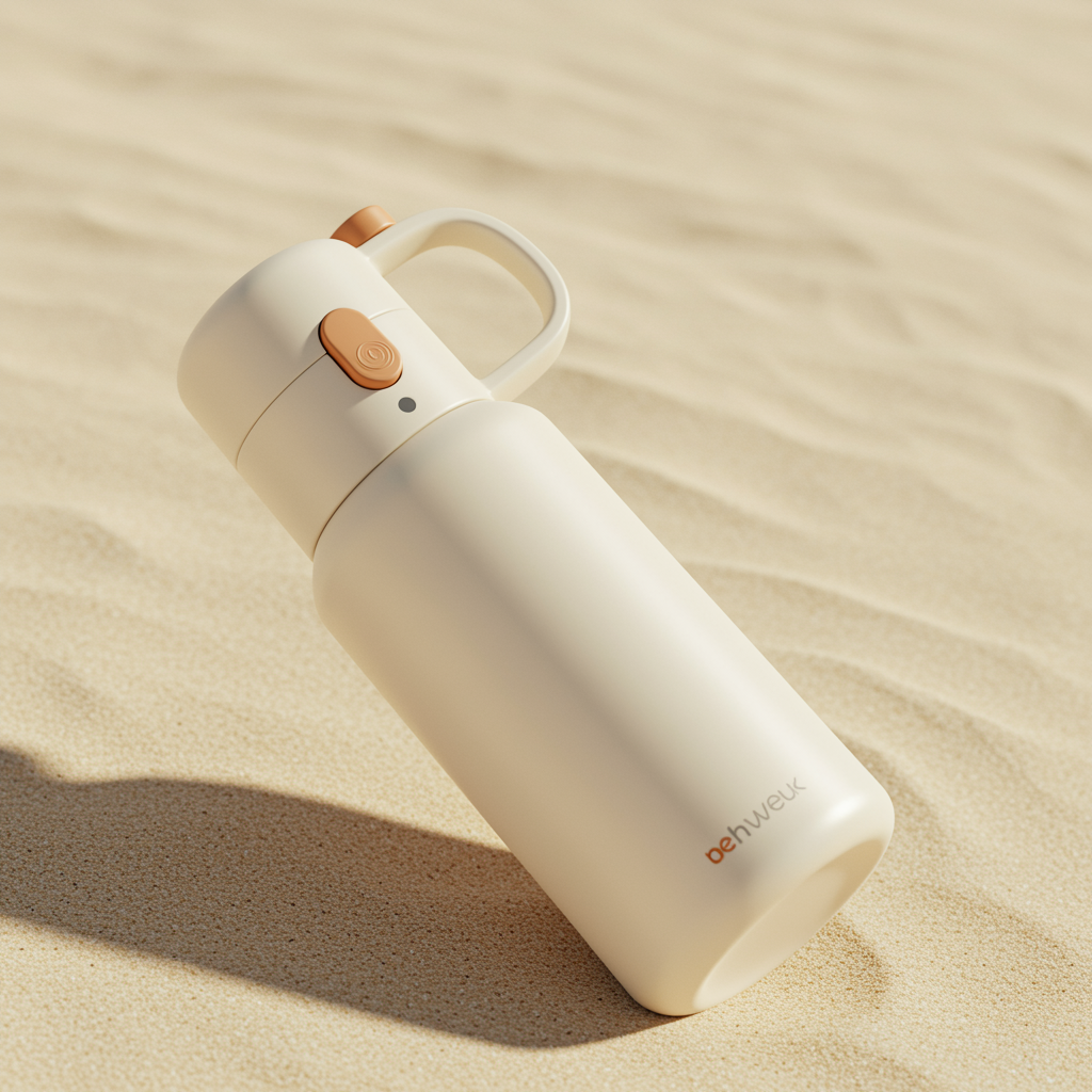 View this AI-generated image featuring a sleek modern cream colored bottle with a satin finish rests diagonally on a subtly textured sandy surface the bottle sports a gently curved compact form and the cap includes an integrated handle the top of the cap is adorned with a muted orange circular butto
