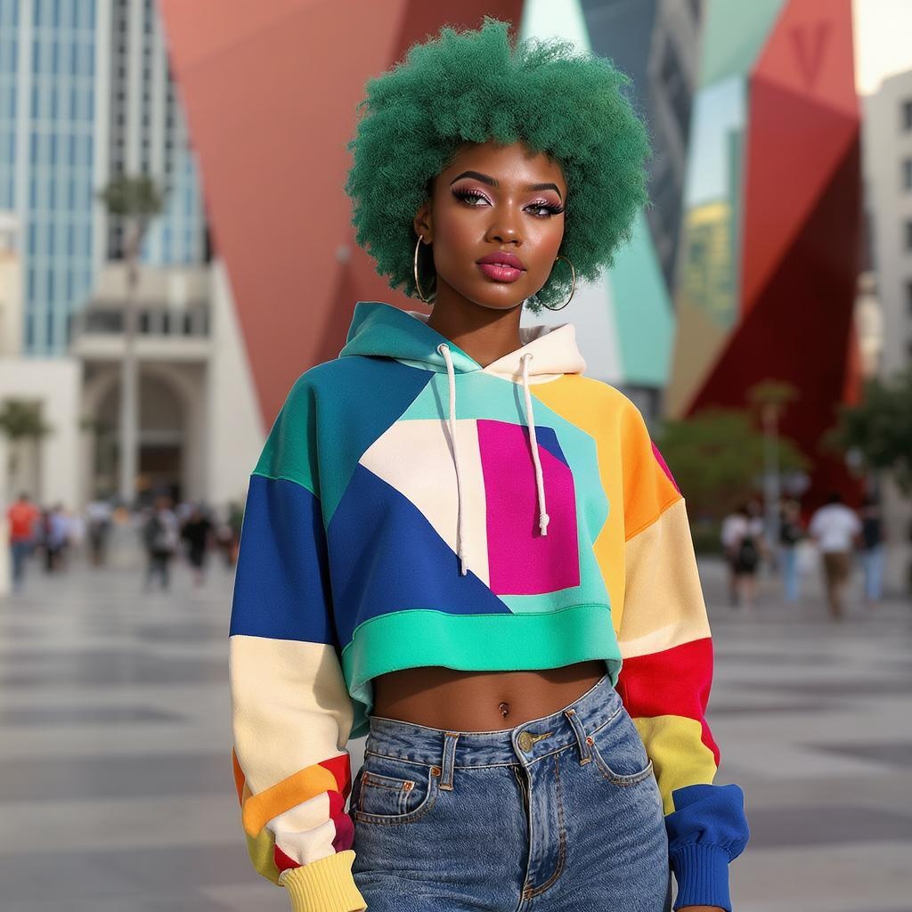 Modernist Constructivist Fashion full body photo of a 24-year-old Anuak-Sinhalese female exuding boho chic beauty with a thoughtful expression and fragmented features. Her medium-tan skin has an olive undertone, radiantly bronzed by regular sun exposure with skin pores and texture sharply in focus. Her soft, pale green eyes have scalloped edges, emphasized by long, elegant lashes. Her haircut is a geometric afro with angular precision, dyed Revolutionary Green. Retro arch-shaped eyebrows complement her delicately featured face. She has strong, rounded shoulders for a commanding silhouette, larger bust, and toned abs. She wears a cropped hoodie with bold graphic panels and midriff reveal, paired with slim-fit jeans featuring geometric color-blocking. She is positioned with a fragmented body rotation reflecting Cubo-Futurism, aligned on the left side using the rule of thirds. The backdrop features a civic plaza with soaring geometric buildings. The atmosphere is illuminated by geometric high-contrast color patterns while the model is gently illuminated with soft natural light reminiscent of Sergei Senkin's style.