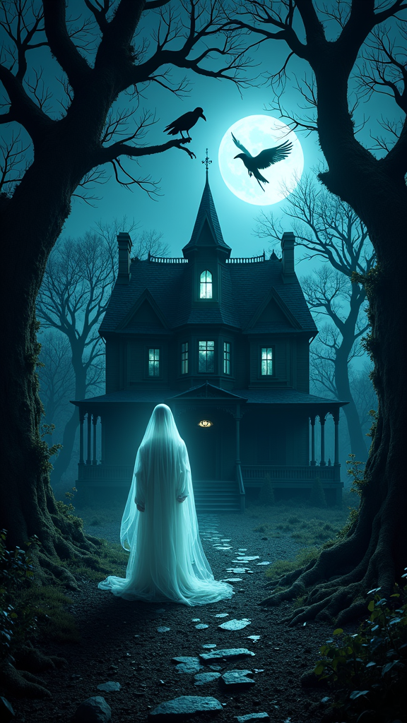 A haunting, moonlit forest where gnarled trees twist into grotesque shapes, their bark resembling tortured faces. Shadows dance menacingly among the dense underbrush, and glowing mist swirls around the roots, casting an eerie luminescence. In the heart of the forest, a dilapidated Victorian mansion stands, windows shattered and walls overtaken by creeping vines. A ghostly figure, translucent and ethereal, hovers near the entrance, its eyes glowing with an otherworldly light, while ravens with midnight-blue feathers silently circle overhead.
