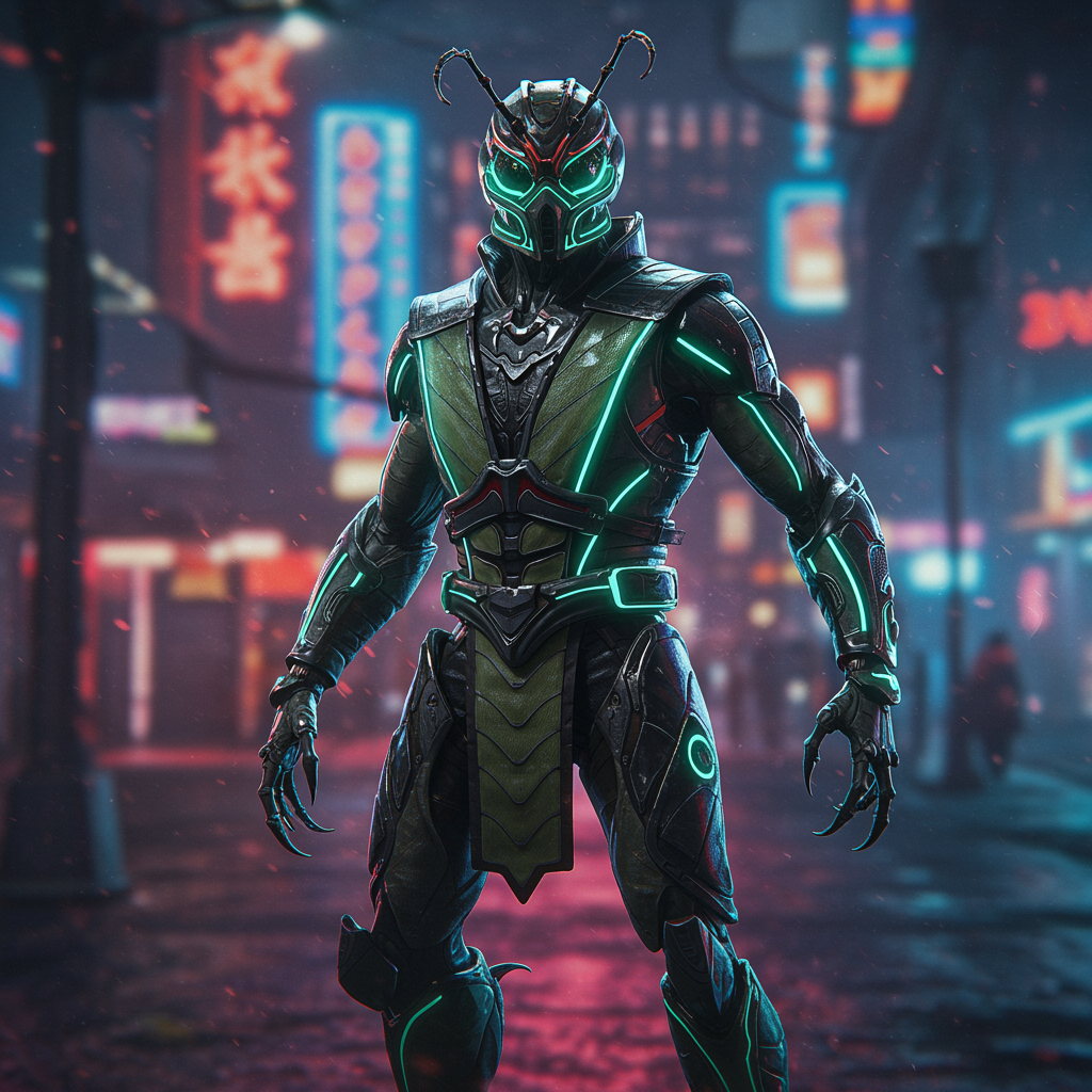 Mortal Kombat inspired character, insectoid warrior fused with cyberpunk elements, set in an outdoor urban street scene, hyperrealistic and photorealistic details, 8k resolution, designed with unreal engine precision, 3d render quality, vertical aspect ratio. Protagonist features biomechanical exoskeleton with neon accents, surrounded by a futuristic cityscape under ambient neon lighting, blending gritty realism with expressive and dynamic textures and enhanced with intricate cybernetic details.