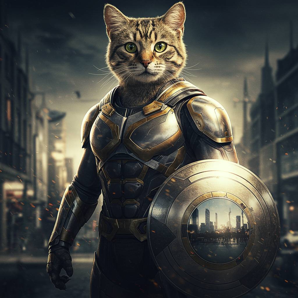 A hyper-realistic movie poster features an anthropomorphic character with the head of a regal cat, adorned with intricate fur details and expressive, vivid eyes. This feline hero stands confidently with a muscular humanoid body, clad in a stylized, futuristic armored suit reminiscent of a legendary superhero. A shimmering, intricately designed shield is held firmly, reflecting elements of a modern cityscape in its polished surface. Set against a dramatic backdrop with dynamic lighting and shadows, the scene conveys a sense of epic adventure and courage.