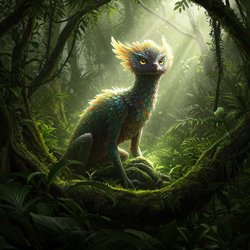 Mystical creature nested in the heart of a lush jungle, intricate details, enchanted glow, hyper-realistic, vivid hues, beams of ethereal light filtering through the canopy, high dynamic range, --aspect ratio 9:16.