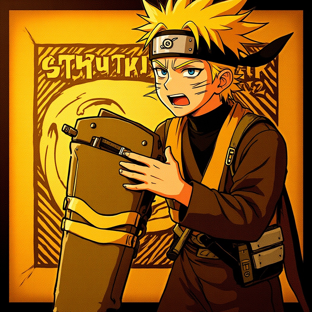 View this AI-generated image featuring naruto anime wallpaper featuring a cyberpunk dystopia theme infused with light yellow and dark orange tones the scene is depicted through the lens of a realistic oil painting combined with the storytelling depth of an associated press photo zigzag patterns are