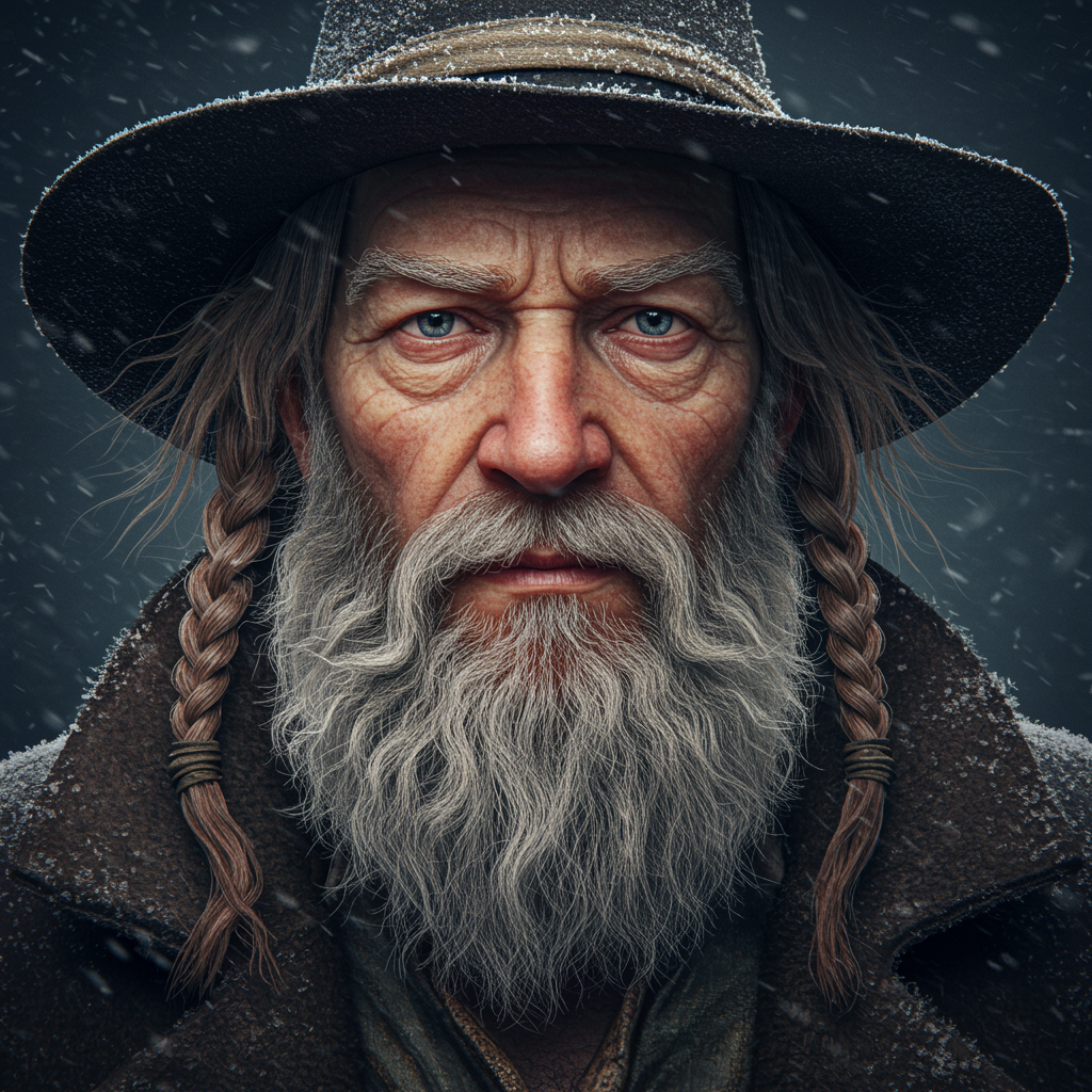 Old man with a long beard, sidelocks, and a hat, caught in a windswept scene with beautifully crafted studio lighting. Saturated colors highlight the intricate details and perfect features, achieving ultra-realism with photo-realistic quality. Ultra-sharp, detailed eyes with reflections, and meticulously detailed vibrant hair enrich the storybook illustration style. The atmosphere is freezing and dramatic, with cinematic lighting akin to an unreal engine render. Hyper-detail and volumetric lighting are present, akin to an octane render. Captured in 8k resolution with HDR, yet exhibiting occasional low-res text errors, such as missing or extra fingers, and cropped images. Includes aspects of jpeg artifacts, signatures, bad anatomy with extra or missing limbs, poorly drawn hands and feet, disfigured parts, out-of-frame elements, tiling effects, and elements of bad art. Some images may appear deformed, mutated, blurry, or fuzzy, with misshaped and mutant features that might seem gross or ugly. Presence of watermarks or text elements may also be noted.