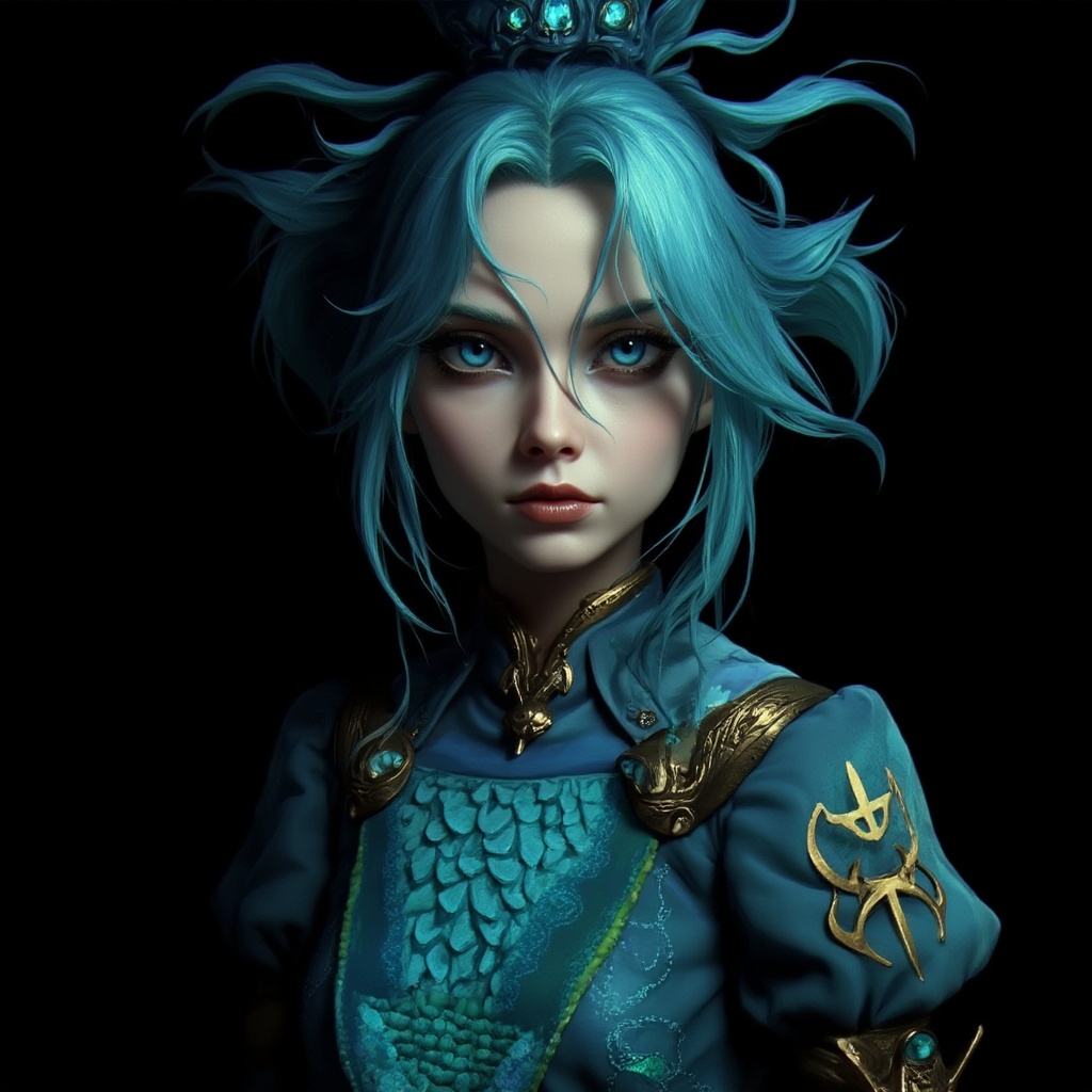 One Punch Man's Tornado character gazes directly at the viewer against a deep black background, portrayed in a realistic and hyper-detailed manner. Her appearance draws inspiration from transfixing marine scenes, incorporating elements of aquatic life with intricate scales and oceanic hues. Her outfit hints at the whimsical and eclectic nature of dolly kei, with touches of ornate accessories resembling dragoncore aesthetics. The close-up reveals her intense and expressive eyes, surrounded by windswept hair that mingles seamlessly with the sea-inspired elements. The overall image captures a balance between realism and a fantastical, otherworldly charm, with a vertical 4:7 aspect ratio enhancing the composition.