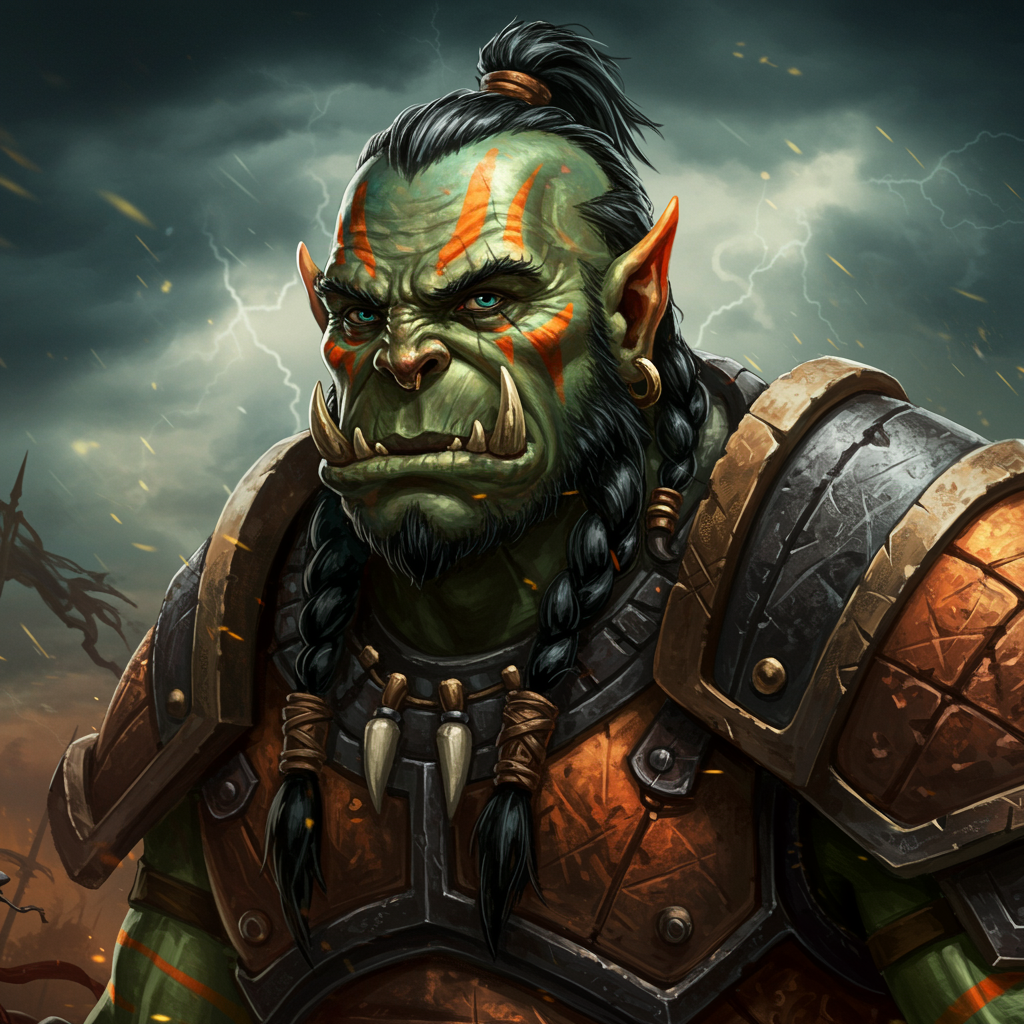 View this AI-generated image featuring orc chieftain from a fantasy realm medium closeup vividly realistic high dynamic range intricate facial features cinematic atmosphere teal and orange tones with tribal markings and battle worn armor standing with a commanding presence against a stormy sky backd
