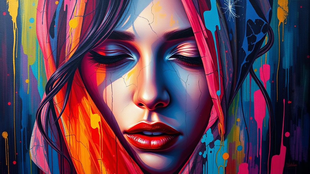View this AI-generated image featuring a canvas painting of a woman enveloped in vibrant hues reminiscent of martin ansin s style featuring serene cracked faces the artwork incorporates dimitry roulland s paint dripping technique with stunning luscious colors and intricate geometric patterns creatin