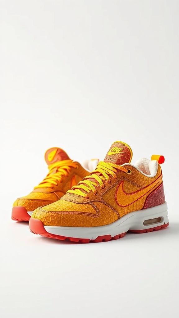 Pair of sneakers crafted from vibrant, dried fruit peels, showcasing a sleek design with bold, bright colors, set against a minimalist backdrop, featuring an artistic Nike logo integrated seamlessly into the composition.