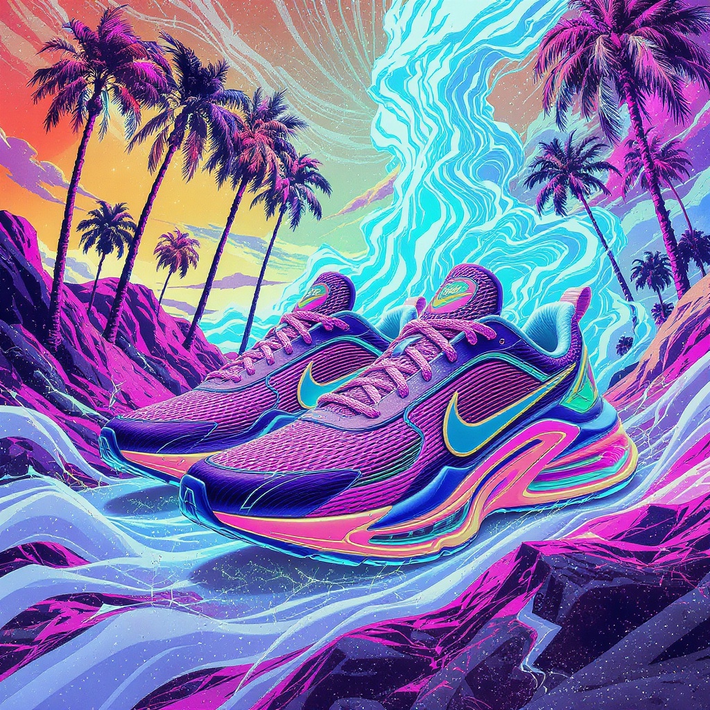 A vibrant pair of futuristic sneakers set against a dreamy backdrop of swaying palm trees, infused with the essence of Dmitry Levitzky's intricate style. The design echoes the ethereal and avant-garde aesthetics found in the Grimes - Book 1 album cover, blending seamlessly with art deco outrun elements and anime influences. This scene evokes the bold, eclectic vibe of Juxtapoz magazine, featuring the iconic silhouette of Nike Air Max with bold, electrifying hues and sleek, aerodynamic lines.