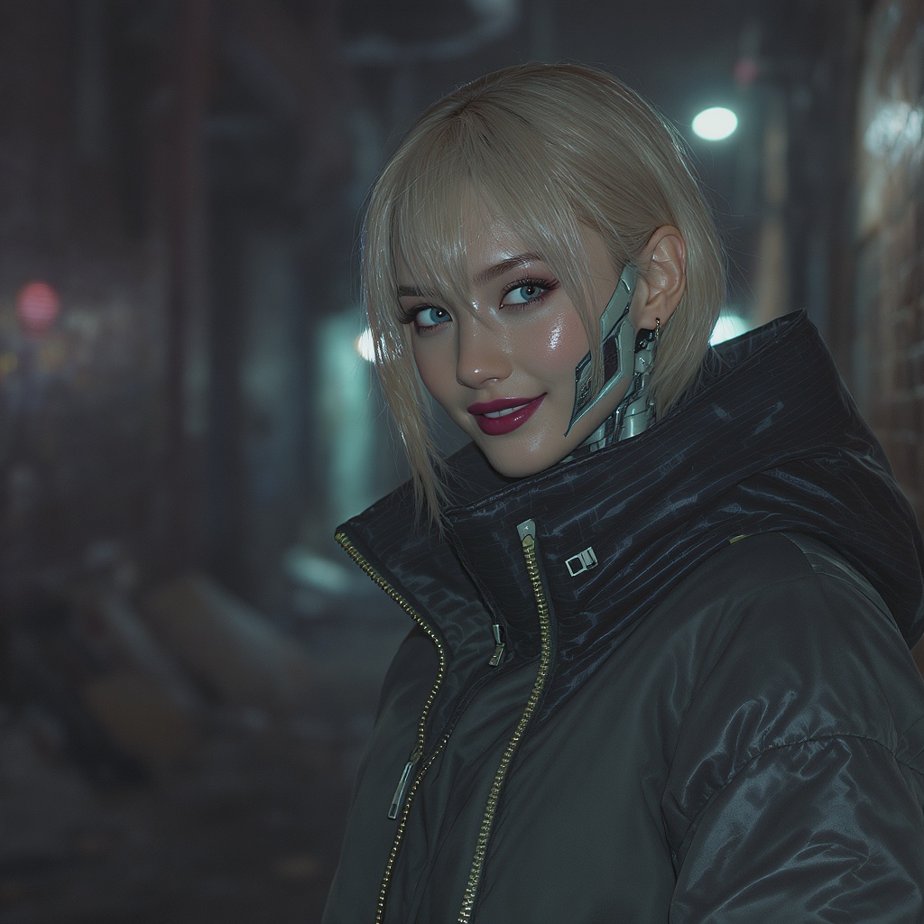 Pastel lighting, a mysterious smile, bright and piercing eyes, beautiful young cyborg girl inspired by Deus Ex Mankind Divided style, sleek and stylish blown jacket reminiscent of fashion magazine aesthetic, clothing jacket, set in a slum alley at night in the city, with natural glossy hair perfectly styled, captured with 150mm focal length at ISO 100, avoiding any digital imperfections, maintaining clarity and elegance, no jpeg artifacts, flawless anatomy, avoiding any unnatural or distorted features, ensuring a visually appealing and captivating image.