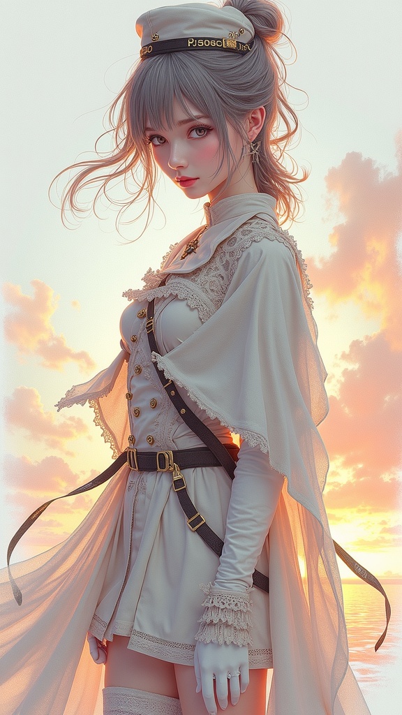 A delicate pencil drawing on pristine white paper captures a striking figure: a young woman with meticulously disheveled hair, her eyes meeting the viewer's with an expression of melancholy. She stands poised amidst a backdrop of vibrant colors, clouds drifting lazily across a sunset sky. One eye is obscured by a bandage, adding an aura of mystery. Her attire, an exquisite blend of military regalia complete with a flowing cape, lace accents, ribbons, stockings, and a distinctive hat, flutters as if caught in a gentle breeze. Light particles dance around her, enhancing the surreal atmosphere. The composition is dynamic, reminiscent of an epic game CG, with a battlefield subtly implied in the background. The detailed artwork highlights her perfect face, finely detailed fingers adorned in white gloves, and piercing eyes, creating an ultra-detailed illustration worthy of a masterpiece. This high-resolution image serves as both a captivating wallpaper and a cover, showcasing the incredible depth and beauty of the scene through expert use of ray tracing and depth of field effects.