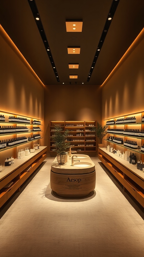 View this AI-generated image featuring photo of a sleek aesop branded store interior showcasing a minimalist design with soothing low illumination indirect lighting complemented by amber hued square main lights the walls are gracefully adorned in a soft elegant bronze tone while the floor features a