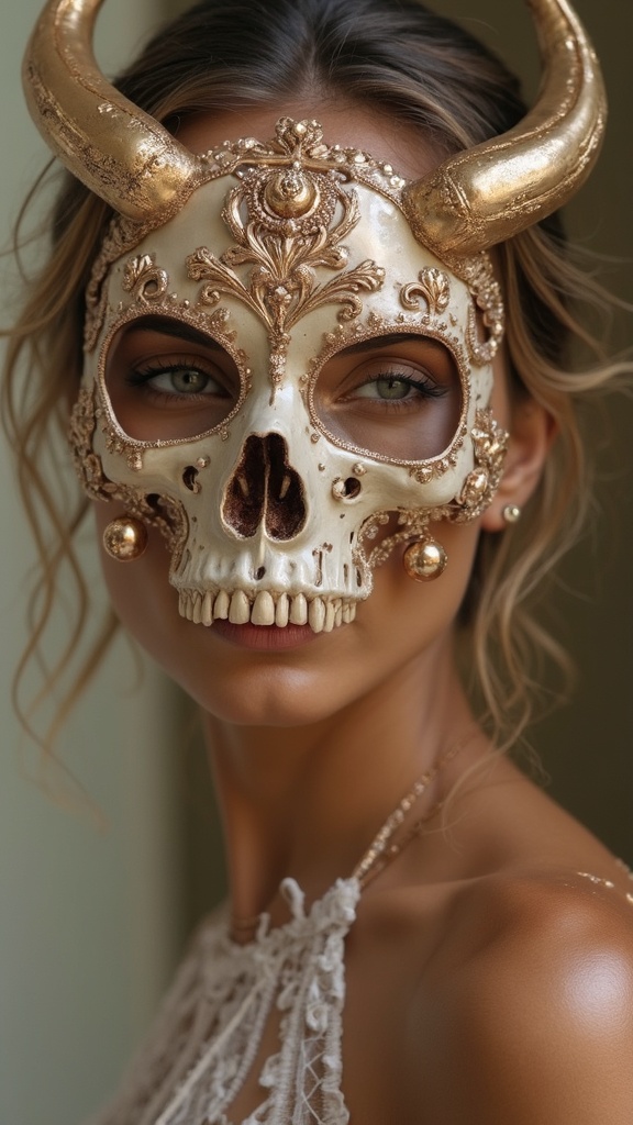 Photo portrait of a woman adorned with an intricate skull and bone mask, featuring rose gold and ivory tones, her gaze intense and direct, styled in a frontal vogue manner. The composition exudes a dreamy celestialpunk ambiance, with baroque-inspired embellishments adding depth and complexity. The woman's tan skin contrasts elegantly with the metallic and pale hues, embodying high fashion editorial allure. Captured with a Canon 50mm 1.2L lens, providing ultra-sharp details and a rich texture. Ambient light creates soft reflections on the mask, enhancing the ethereal atmosphere of the imagery while maintaining a raw, stylized artistic flair.