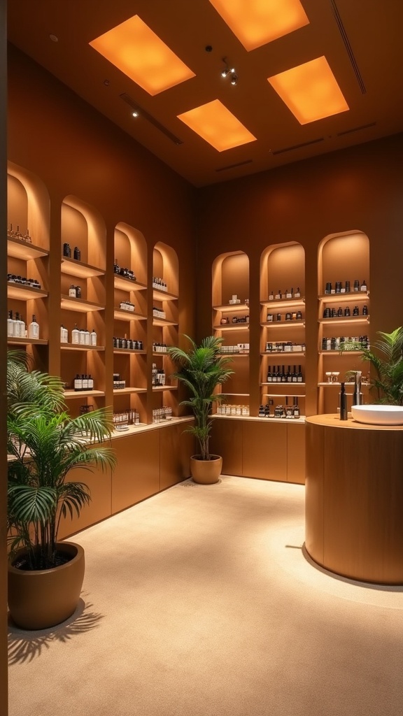Photo of an Aesop-inspired store design featuring a minimalistic interior space with soft, warm indirect lighting and distinctive orange-tinted square main lights. The walls exude elegance with a bronze finish, paired with a plush beige carpet underfoot. A variety of products are thoughtfully displayed on the walls and uniquely designed Irish displays. The centerpiece, an elegant curved wooden structure, incorporates sleek faucets and sinks. Strategically placed minimalistic plants complement the design, their greenery balancing the intricate play of shadows. Capturing the sophisticated aesthetic in UHD with detailed elements, maintaining an aspect ratio of 16:9, showcasing a raw and authentic style.
