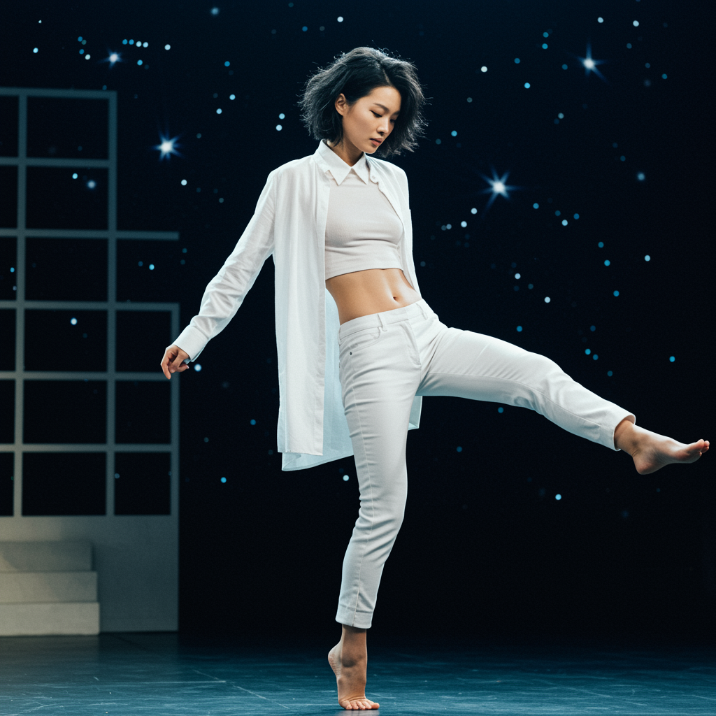 Photo of a slender young Asian female supermodel with small breasts and a flat chest, showcasing her toned abs. She has short, tousled black hair and is wearing a crisp white collarless tunic that highlights her midriff. Her attire includes modern tapered leg trousers. The model kicks one leg up playfully behind her. The scene is composed using the rule of thirds against a backdrop of a Bauhaus-inspired theater stage set. The ambiance includes a minimalist depiction of a starry night sky, with the model softly illuminated by natural lighting.
