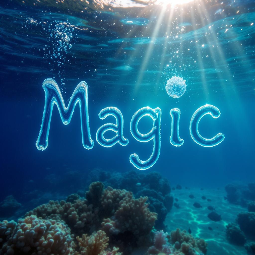 A mesmerizing photograph captures the word "Magic" artistically formed by shimmering water bubbles. These delicate bubbles gracefully shape the letters, momentarily suspended in the crystal-clear blue water before they begin to dissipate. Surrounding the scene is a tranquil underwater landscape, teeming with vibrant marine life. Sunlight streams down through the water's surface, illuminating the ethereal setting with a gentle radiance. The image evokes a sense of wonder and enchantment, immersing the viewer in its mystical allure.